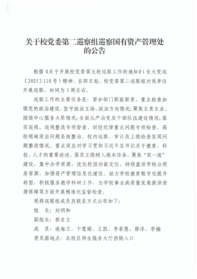 关于校党委第二巡察组巡察国有资产管理处的公告